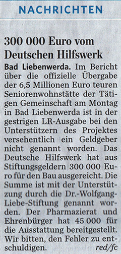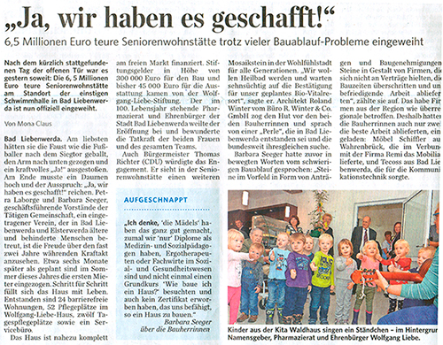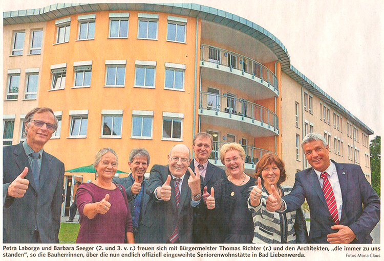 Am Standort der ehemaligen Schwimmhalle in der Heinrich-Heine-Straße 44 in der Kurstadt Bad Liebenwerda haben wir, der „Tätige Gemeinschaft“ e.V., eine neue Seniorenwohnstätte gebaut und eröffnet. Verschiedene Betreuungs- und Wohnkonzepte in der
